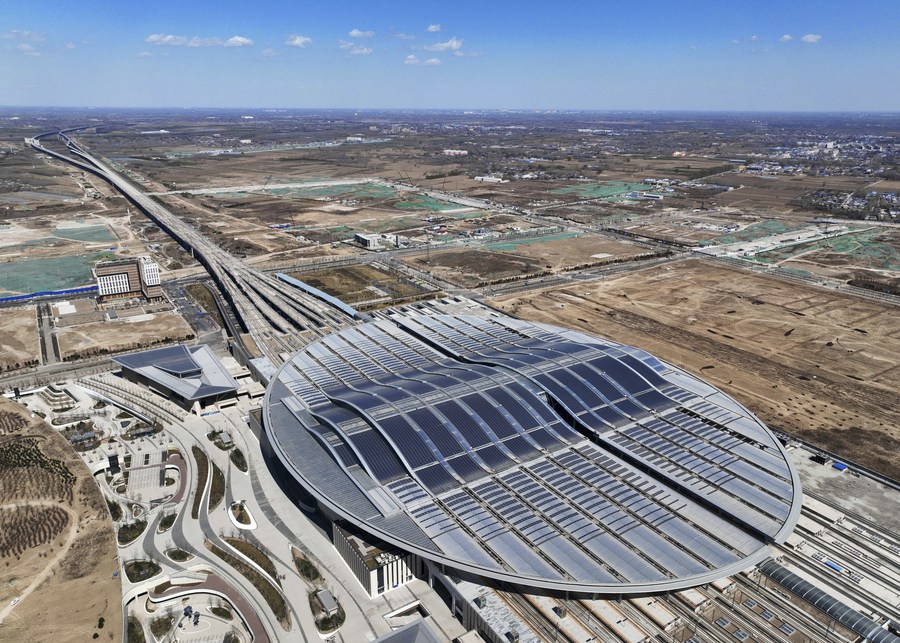 This aerial photo taken on March 31, 2022 shows the Xiong'an Railway Station in Xiong'an New Area, north China's Hebei Province. (Xinhua/Xing Guangli)