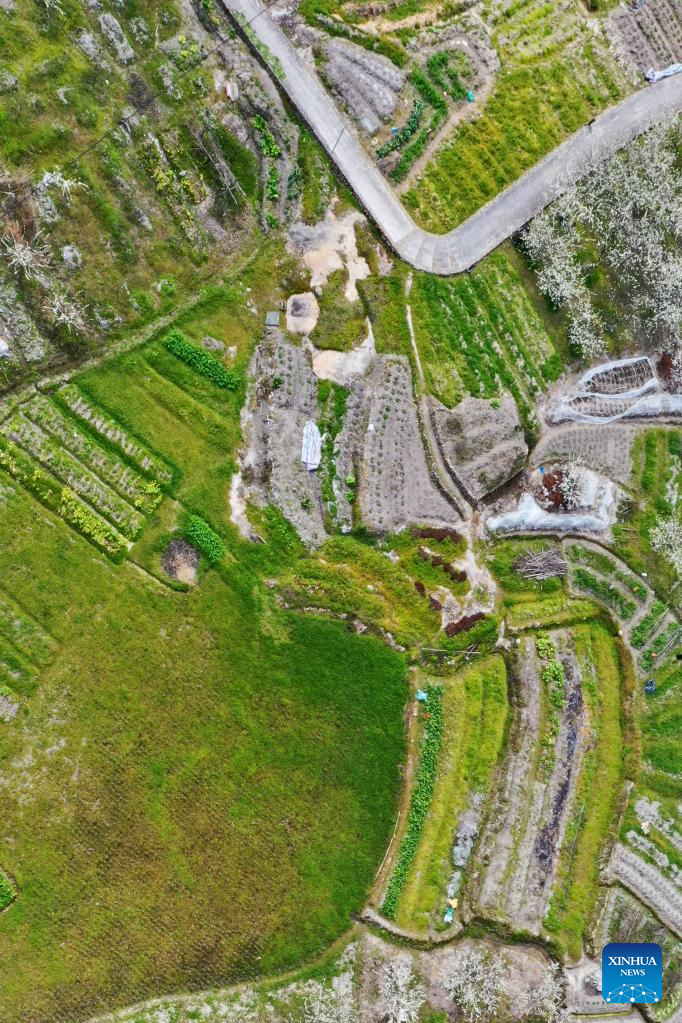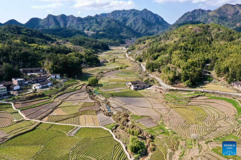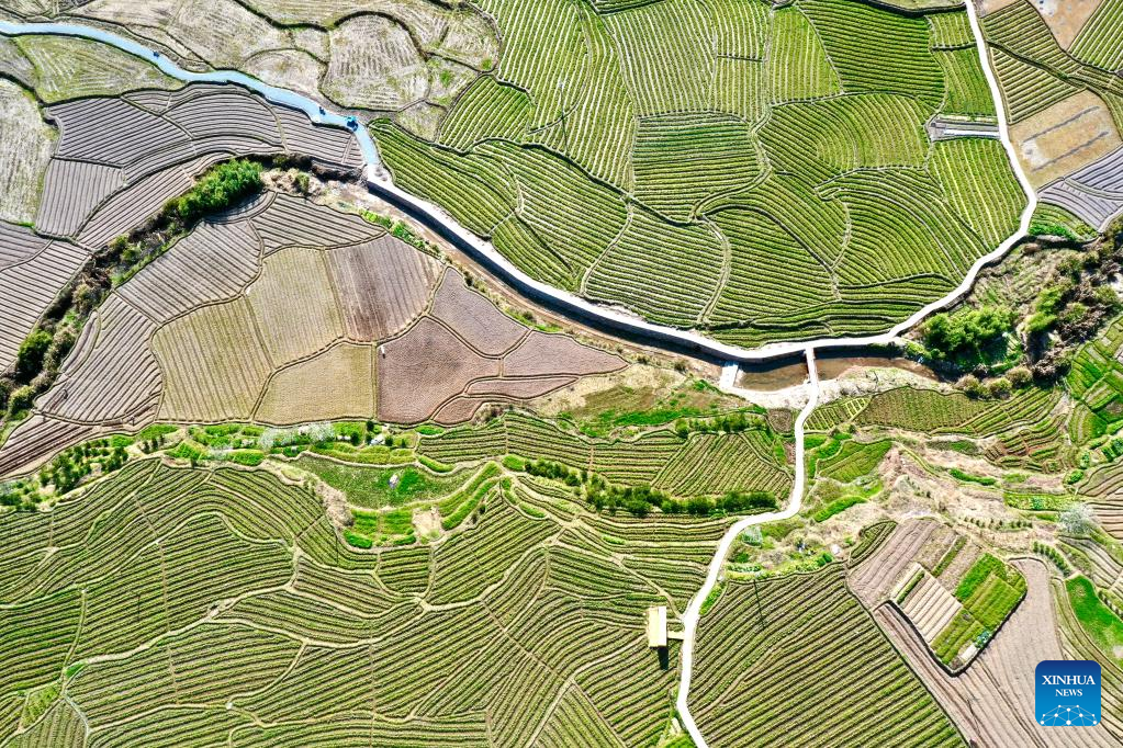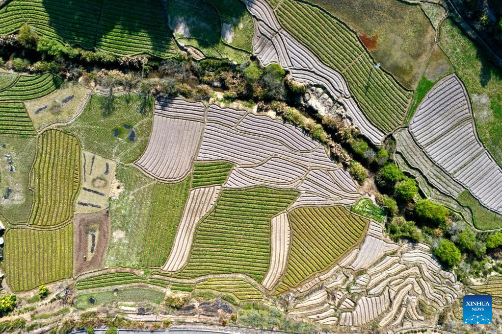 This aerial photo taken on Feb. 24, 2023 shows the view of farmland in Gaiyang Township of Yongtai County, Fuzhou City, southeast China's Fujian Province. Spring ploughing has been started in Fujian Province. (Xinhua/Jiang Kehong)