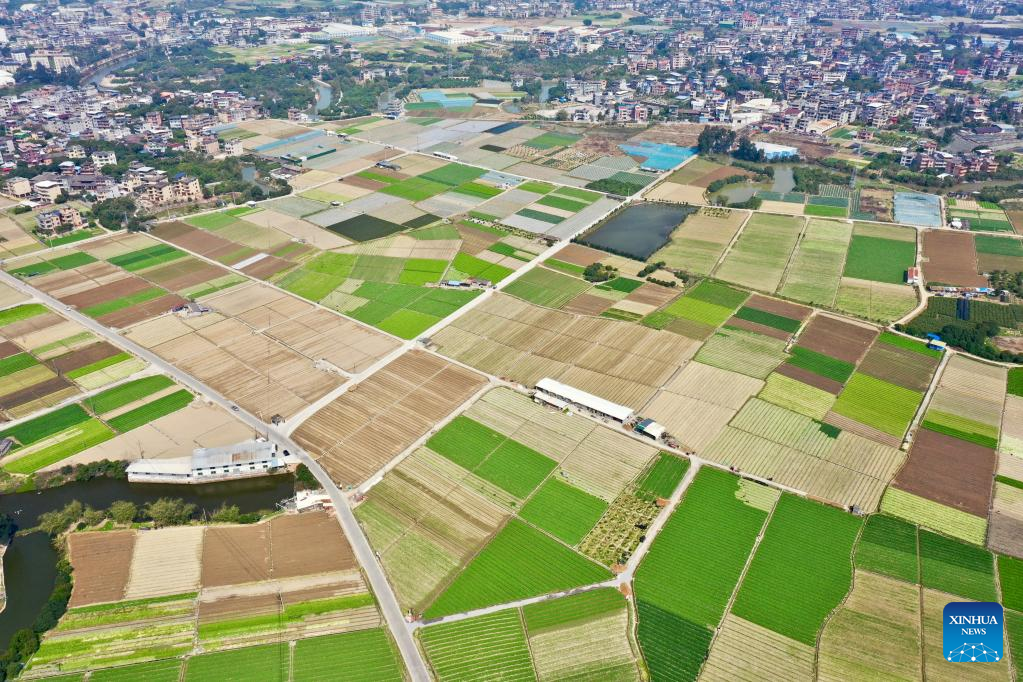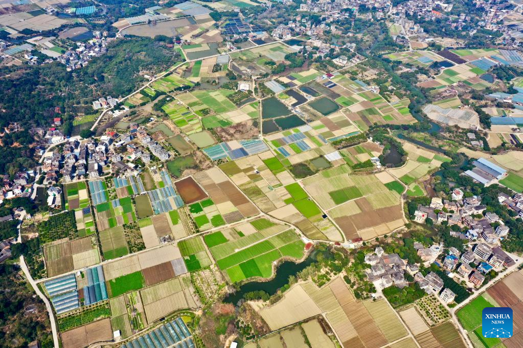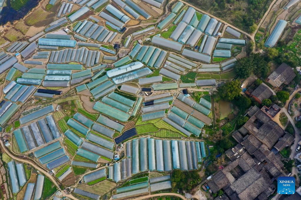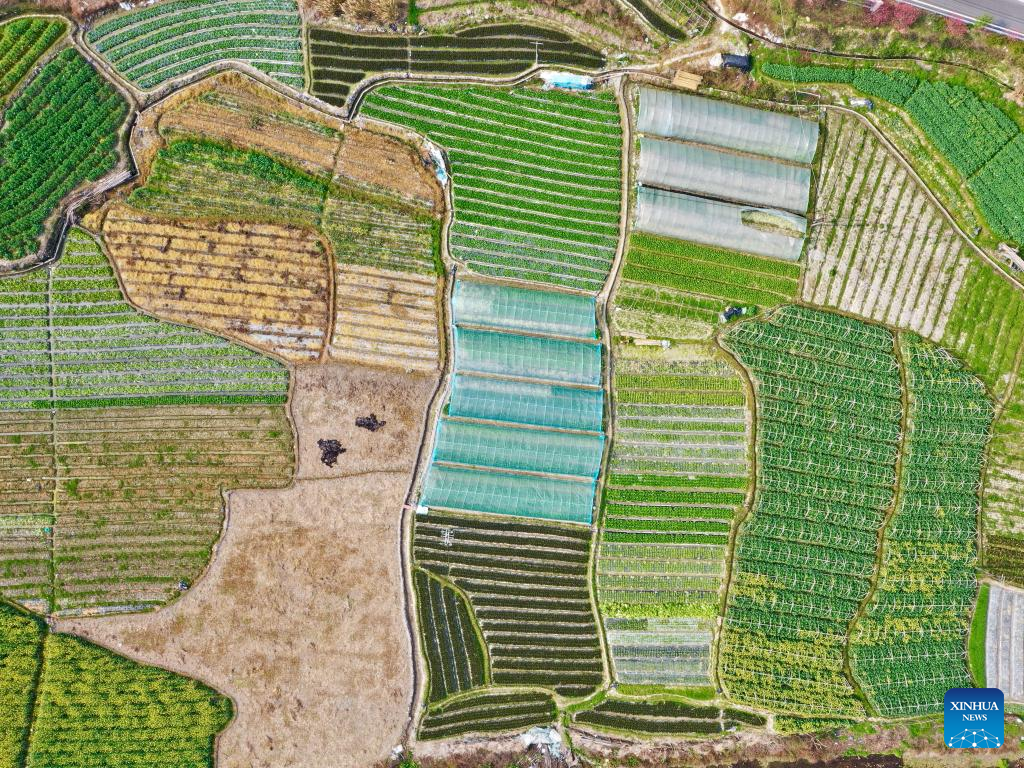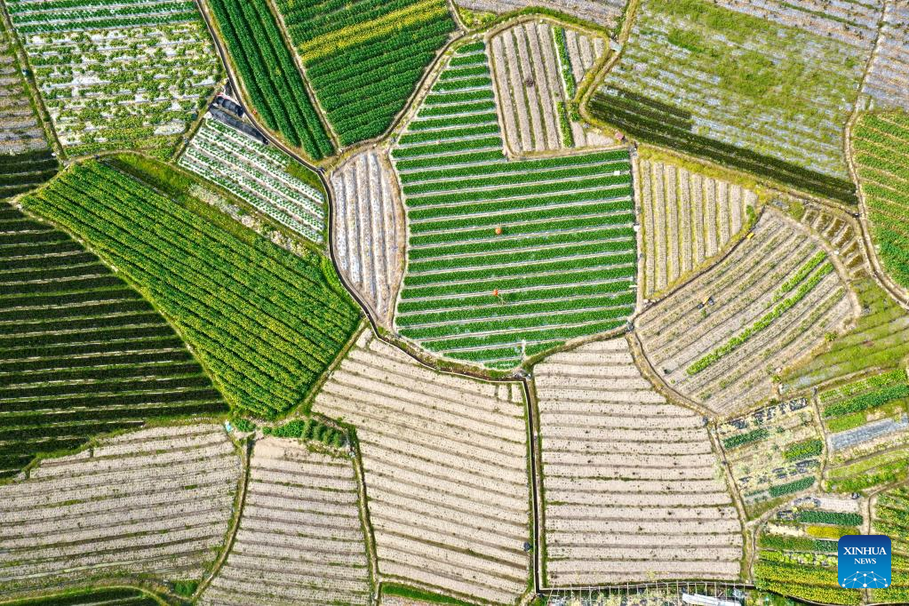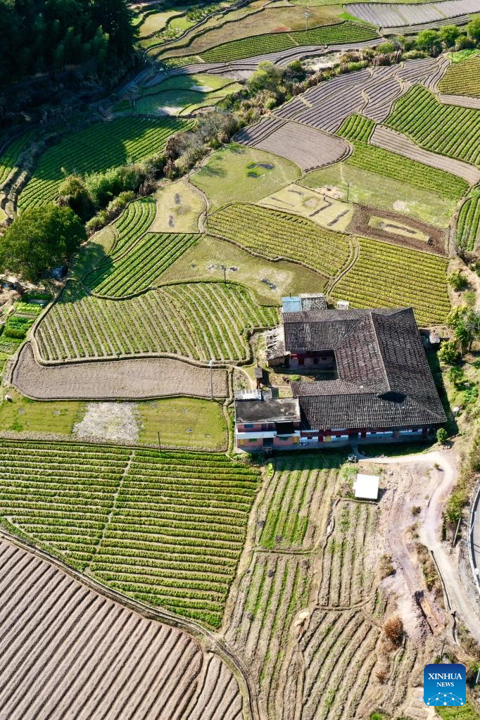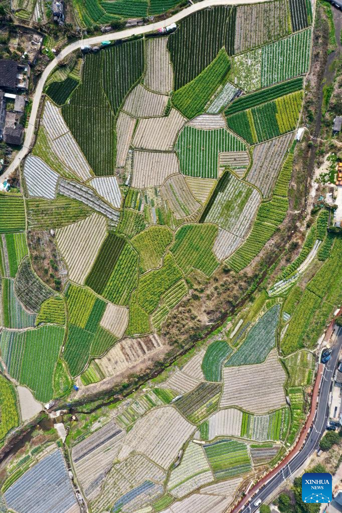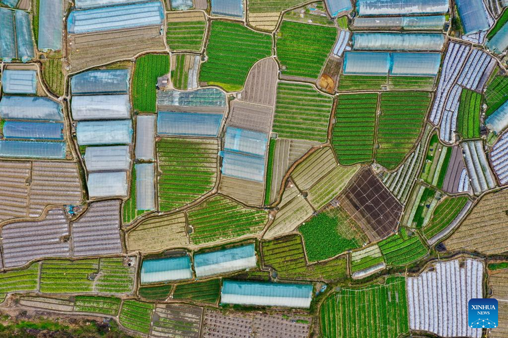 This aerial photo taken on Feb. 25, 2023 shows the view of a vegetable planting base in Jingxi Township of Minhou County, Fuzhou City, southeast China's Fujian Province. Spring ploughing has been started in Fujian Province. (Xinhua/Jiang Kehong)
