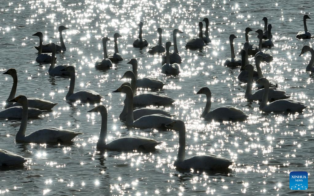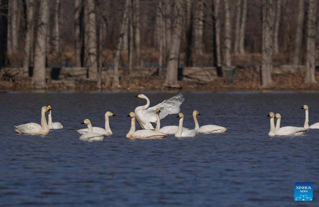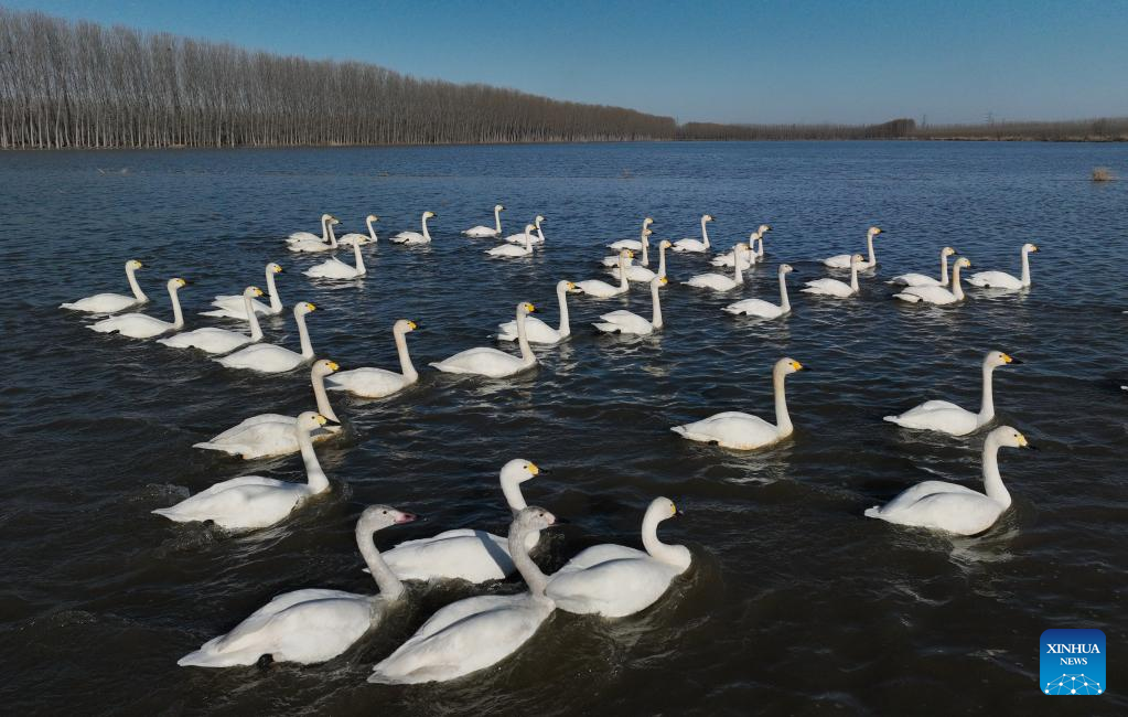 Swans are seen at the Caofeidian wetland in Tangshan, north China's Hebei Province, Feb. 25, 2023. (Xinhua/Yang Shiyao)