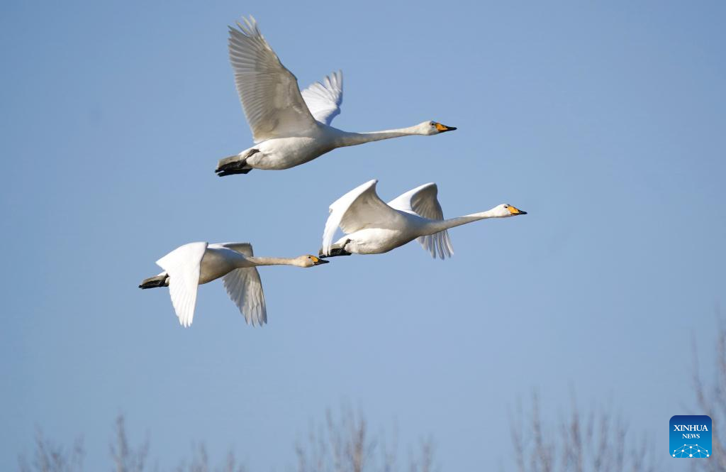 Swans fly over the Caofeidian wetland in Tangshan, north China's Hebei Province, Feb. 25, 2023. (Xinhua/Yang Shiyao)