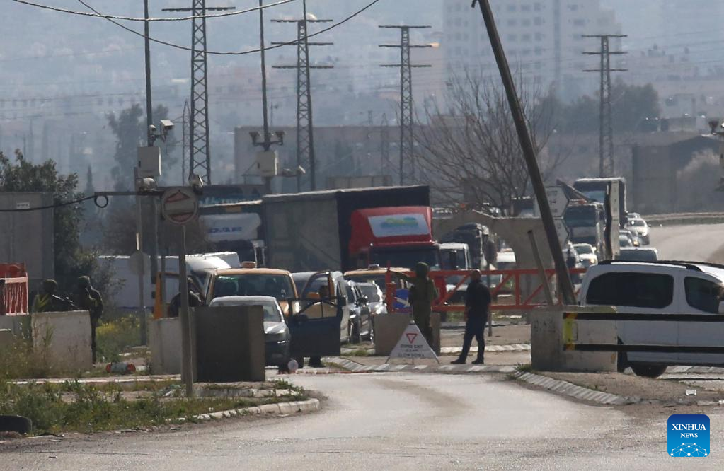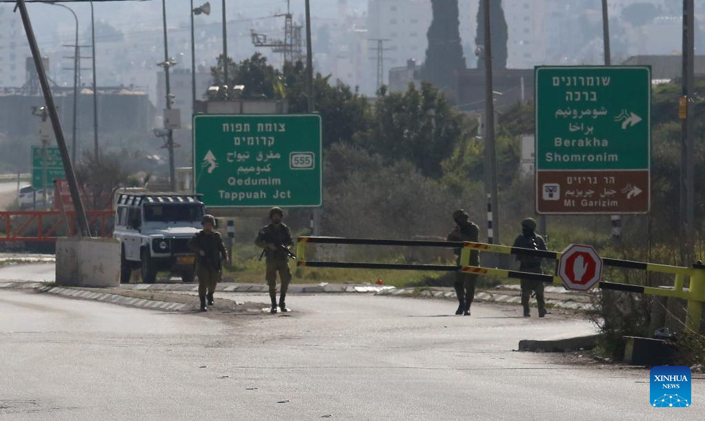 Israeli soldiers close the Hawara checkpoint south of the West Bank city of Nablus, following the killing of two Israelis, Feb. 26, 2023. (Photo by Nidal Eshtayeh/Xinhua)