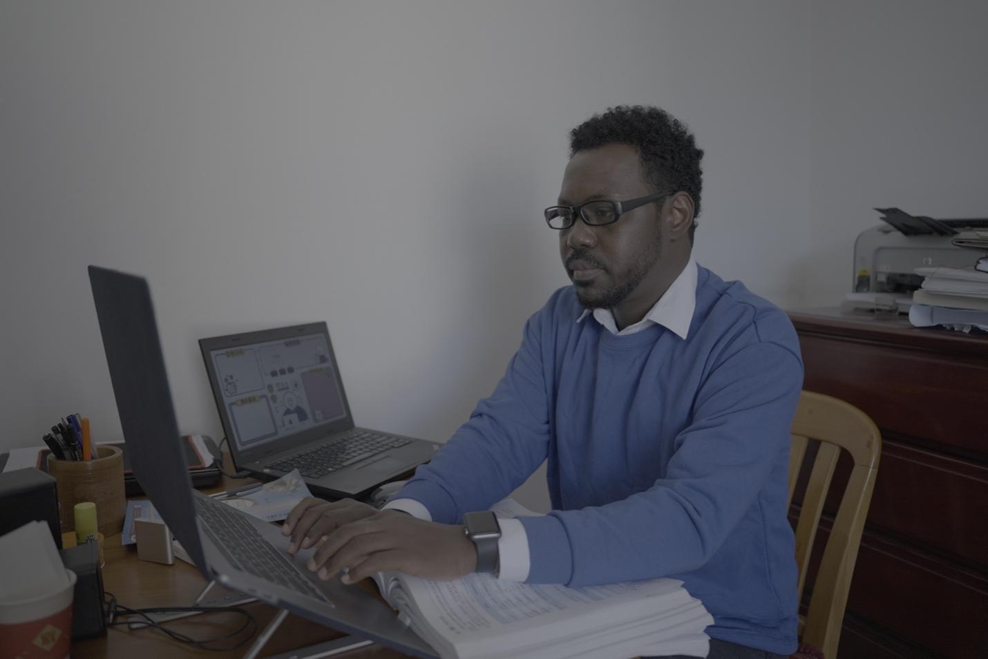 The photo shows Mahamat Hamid Mahamat, a Ph.D. candidate in neurosurgery at the School of Medicine at Nankai University, working at home. (Photo provided by the interviewee).