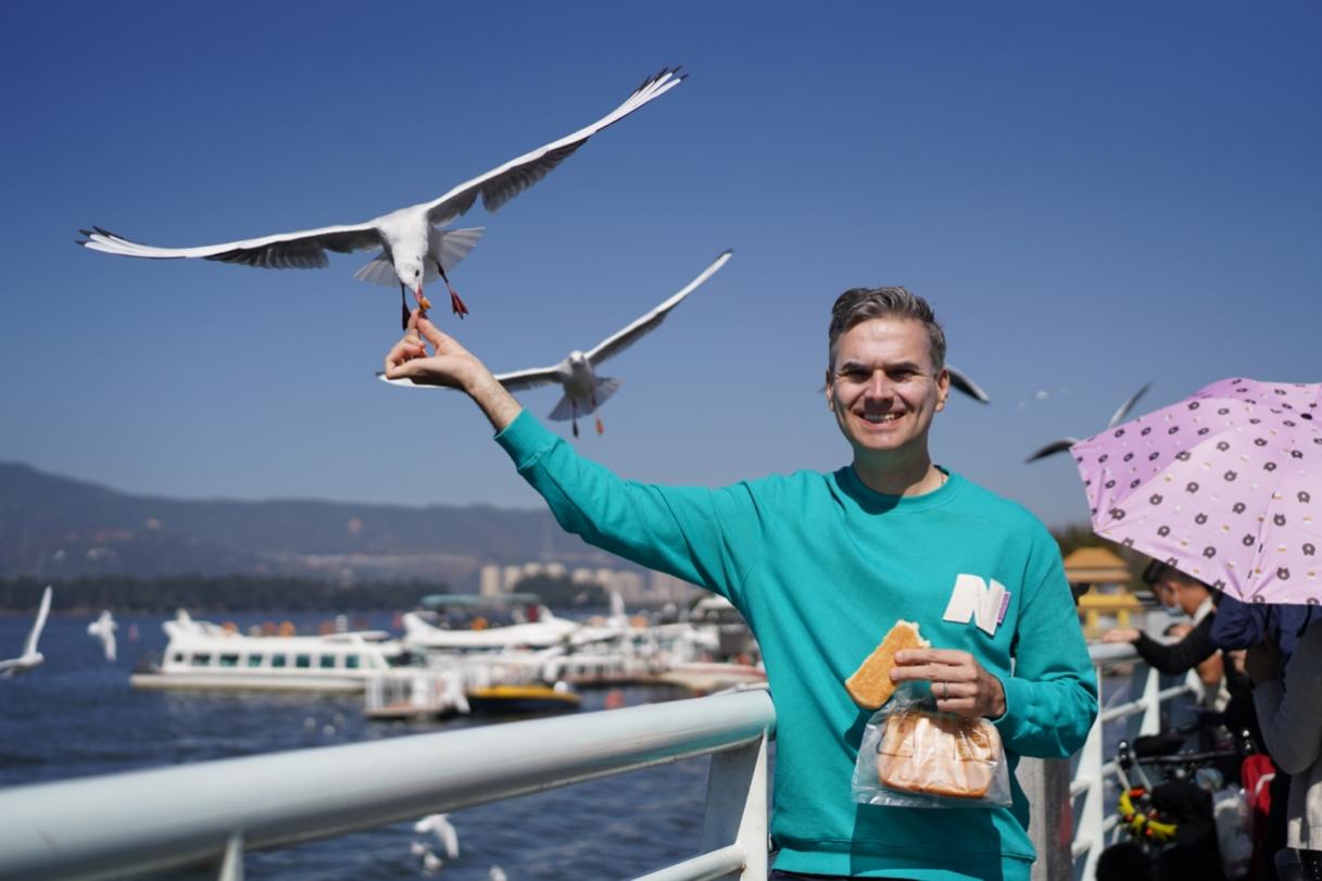 Andre du Plessis feeds seagulls by the Dianchi Lake in Kunming, southwest China's Yunnan Province. (Photo provided by the interviewee).