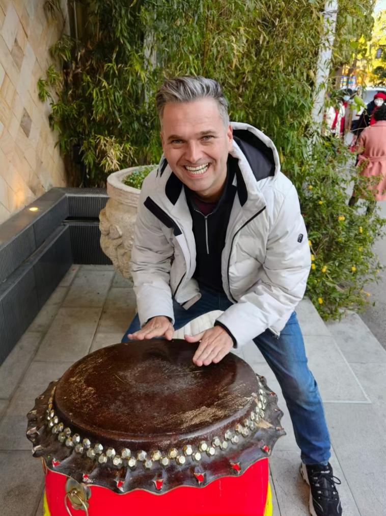 Andre du Plessis plays a Yunnan drum on the streets of Kunming, southwest China's Yunnan Province. (Photo provided by the interviewee).