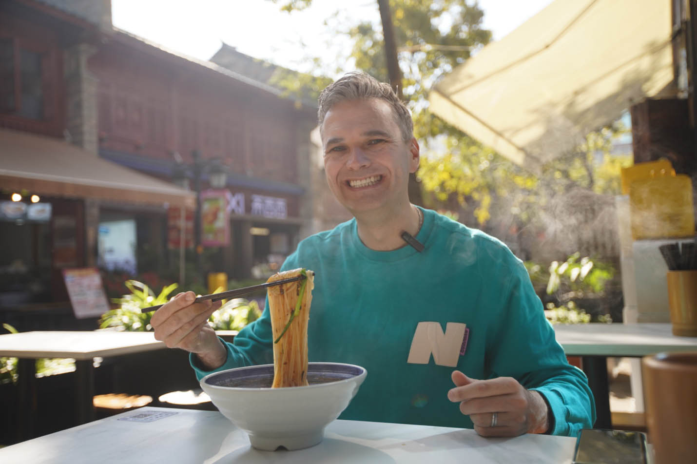 Andre du Plessis enjoys rice noodles on Confucian Temple Street in Kunming, southwest China's Yunnan Province. (Photo provided by the interviewee).