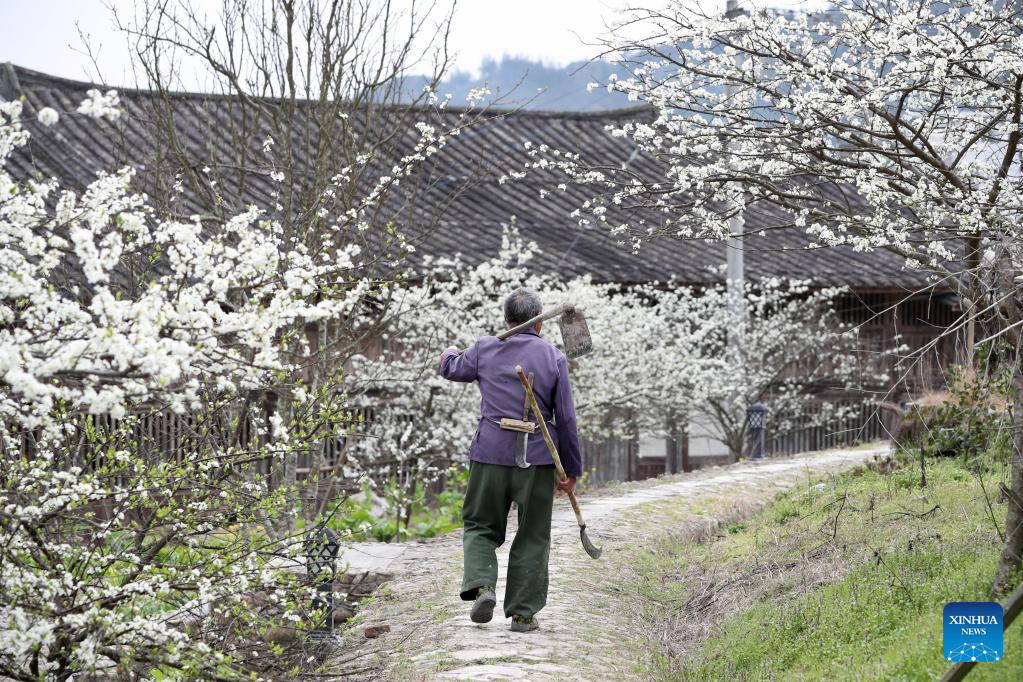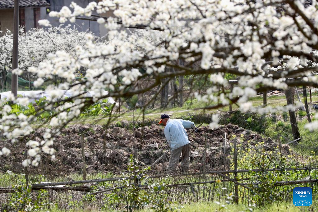 A villager farms amid plum blossoms at Qianhu Village of Yongtai County, southeast China's Fujian Province, Feb. 24, 2023. (Xinhua/Jiang Kehong)