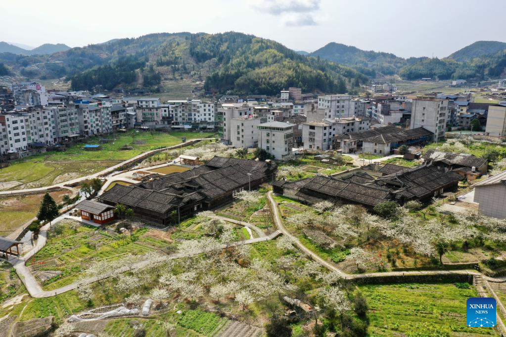 This aerial photo taken on Feb. 24, 2023 shows ancient buildings amid plum blossoms at Gaiyang Village of Yongtai County, southeast China's Fujian Province. (Xinhua/Jiang Kehong)