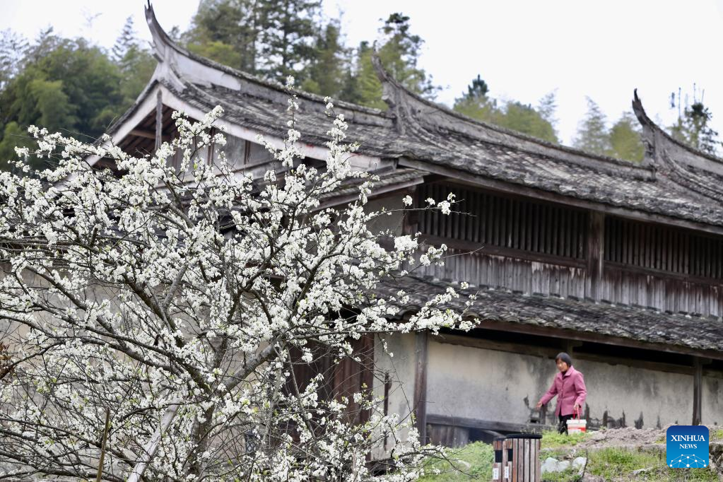 Plum blossoms are seen near ancient buildings at Gaiyang Village of Yongtai County, southeast China's Fujian Province, Feb. 24, 2023. (Xinhua/Jiang Kehong)