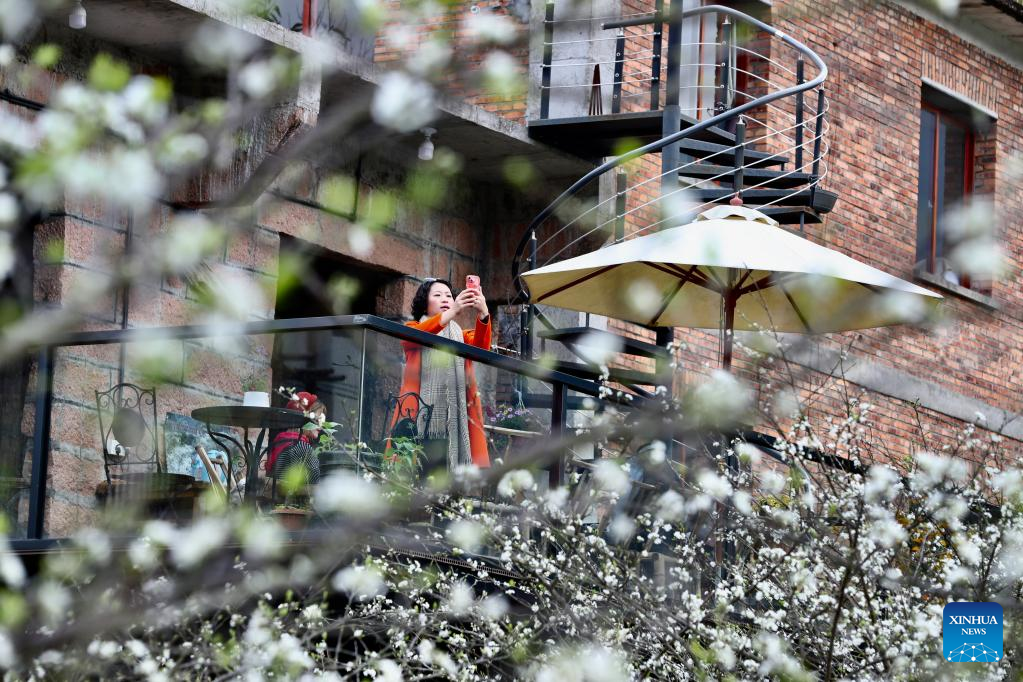 A tourist takes photos of plum blossoms at Daxi Village of Yongtai County, southeast China's Fujian Province, Feb. 24, 2023. (Xinhua/Jiang Kehong)