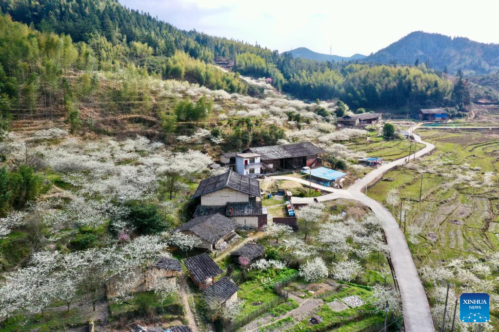This aerial photo taken on Feb. 24, 2023 shows plum blossoms at Daxi Village of Yongtai County, southeast China's Fujian Province. (Xinhua/Jiang Kehong)