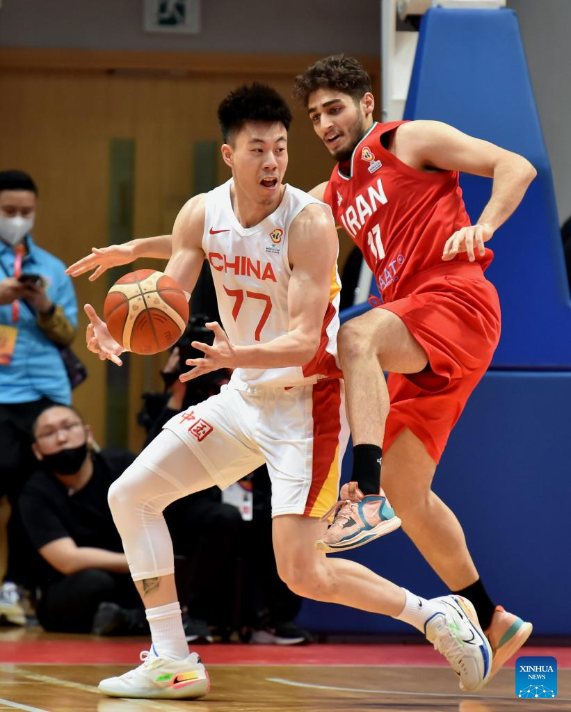 Cui Yongxi (1st L) of China breaks through during the Group F match between China and Iran of FIBA Basketball World Cup Asian Qualifiers in Hong Kong, south China, Feb. 26, 2023. (Xinhua/Lo Ping Fai)