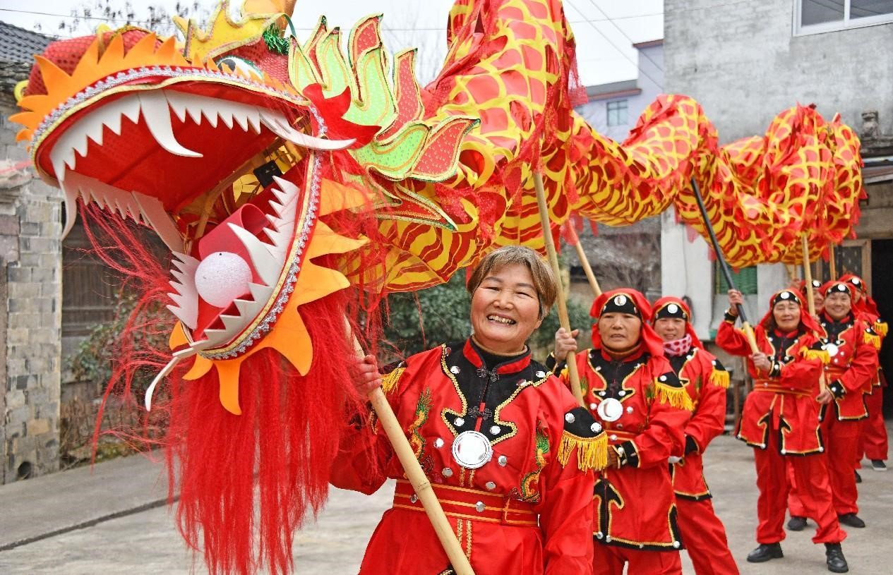 A dragon dance team performs for villagers in Shiduying village, Xianju county, Taizhou, east China's Zhejiang province, Feb. 3, 2023. (People's Daily Online/Wang Huabin)