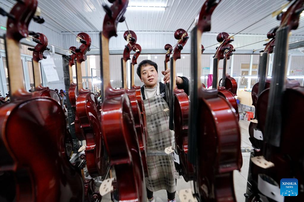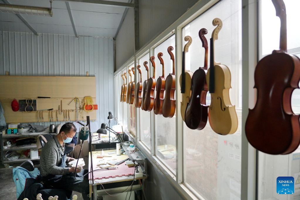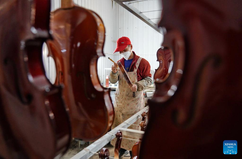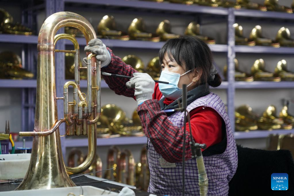 A worker makes a musical instrument at a manufacturer in Wuqiang County, north China's Hebei Province, on Feb. 23, 2023. (Xinhua/Mu Yu)