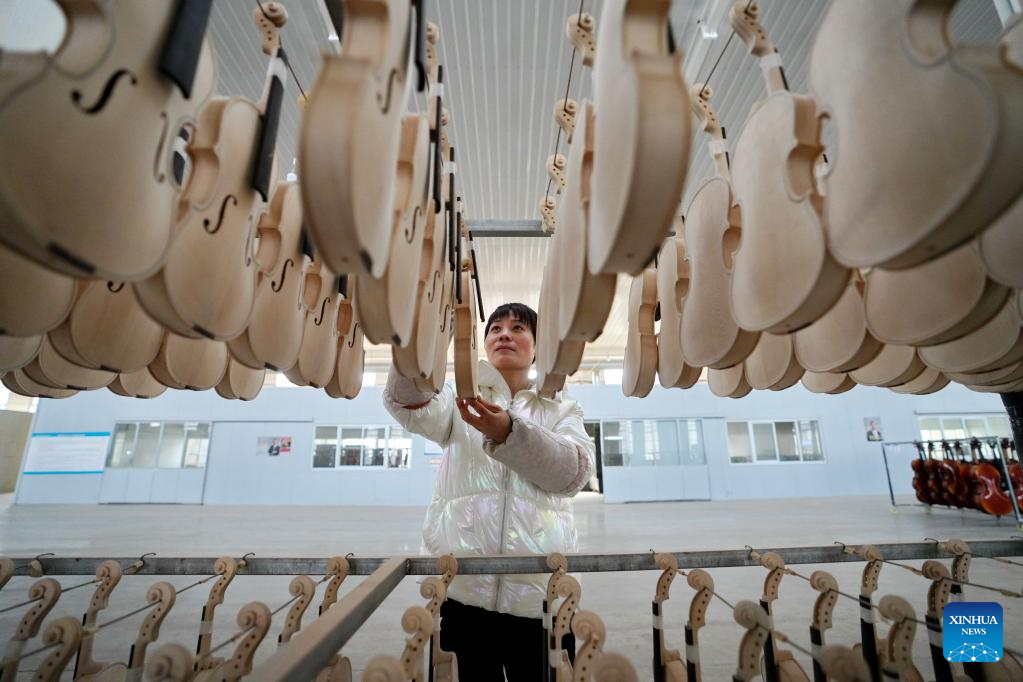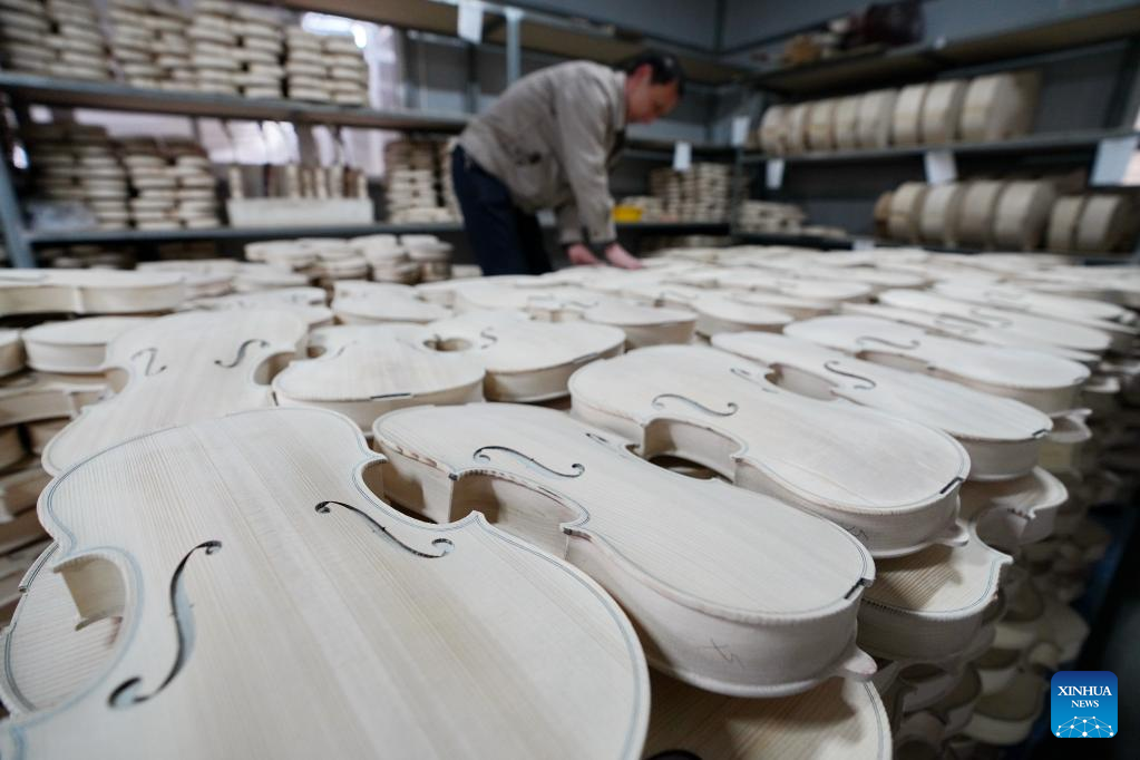 A worker checks violin panels at a manufacturer in Wuqiang County, north China's Hebei Province, on Feb. 23, 2023. (Xinhua/Mu Yu)