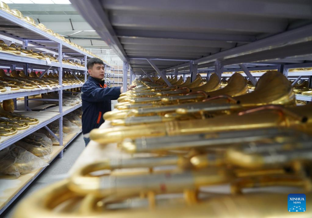 A worker arranges western musical instruments at a manufacturer in Wuqiang County, north China's Hebei Province, on Feb. 23, 2023. (Xinhua/Mu Yu)