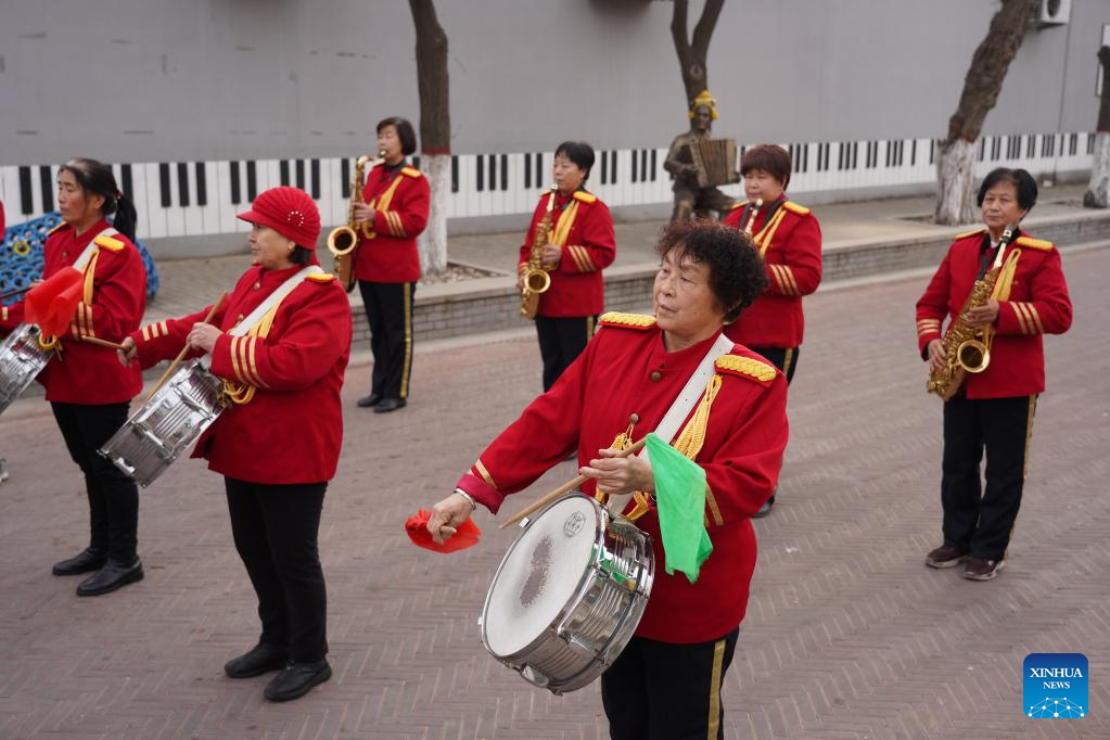 Villagers play music to welcome tourists at Zhouwo music town in Wuqiang County, north China's Hebei Province, on Feb. 26, 2023. (Xinhua/Mu Yu)