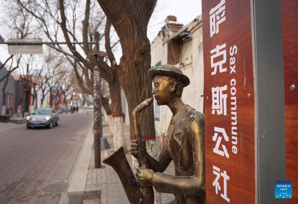 A sculpture of saxophone performer is seen at Zhouwo musical town in Wuqiang County, north China's Hebei Province, on Feb. 26, 2023. (Xinhua/Mu Yu)