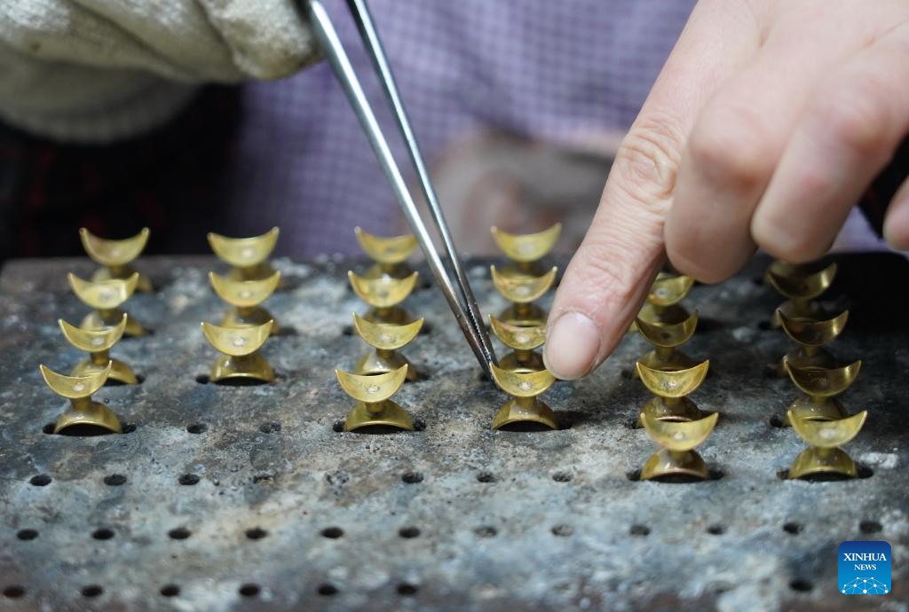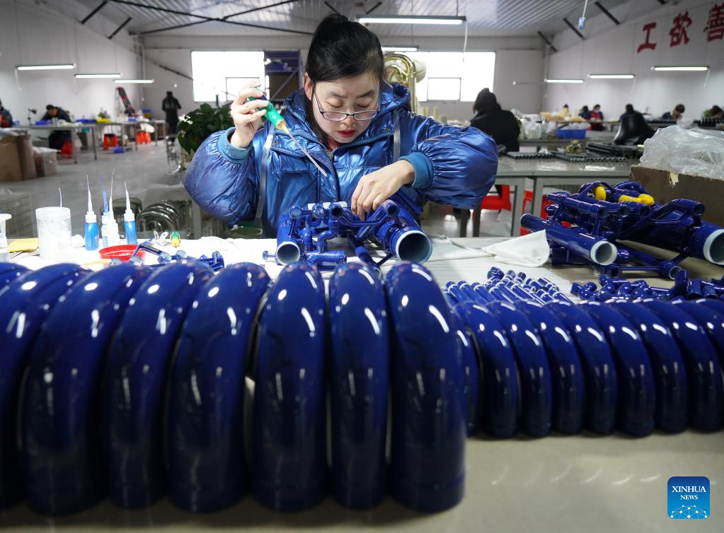 A worker makes components for musical instruments at a manufacturer in Wuqiang County, north China's Hebei Province, on Feb. 23, 2023. (Xinhua/Mu Yu)
