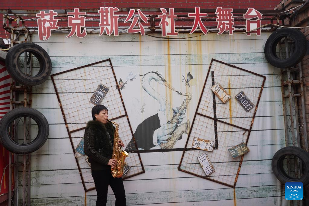 A villager plays the saxophone at Zhouwo musical town in Wuqiang County, north China's Hebei Province, on Feb. 26, 2023. (Xinhua/Mu Yu)