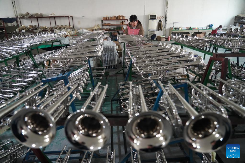 A worker assembles western musical instruments at a manufacturer in Wuqiang County, north China's Hebei Province, on Feb. 23, 2023. (Xinhua/Mu Yu)
