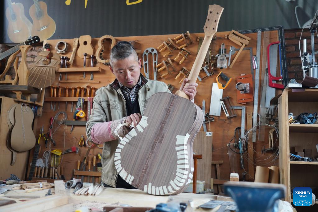A man makes a guitar at a guitar workshop in Wuqiang County, north China's Hebei Province, on Feb. 26, 2023. (Xinhua/Mu Yu)