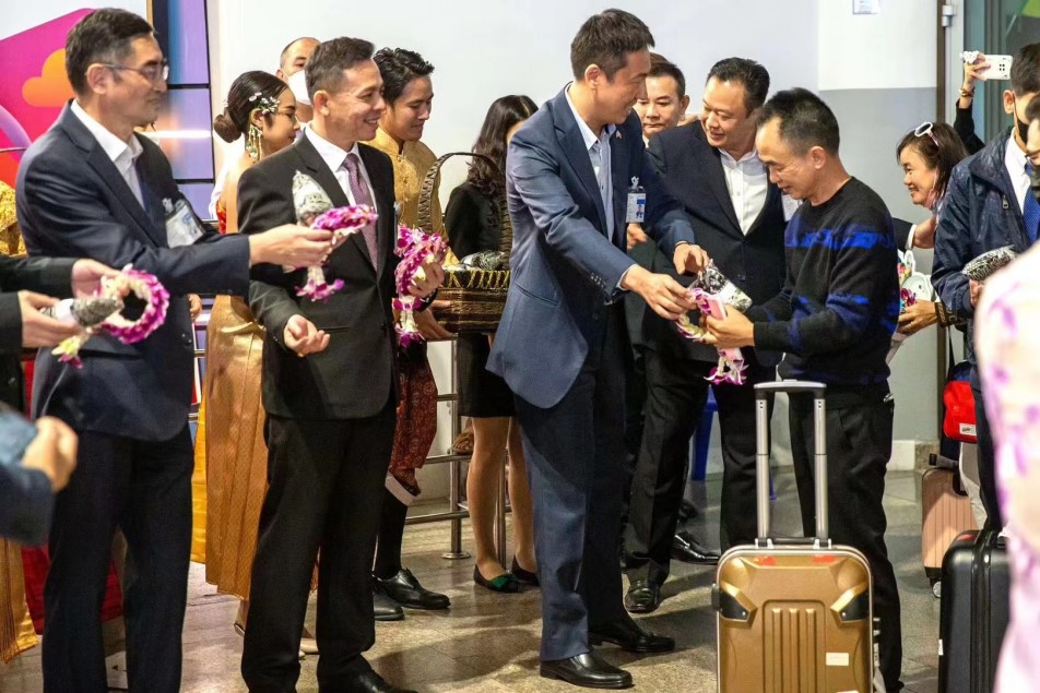 A welcoming ceremony is held at the Don Mueang International Airport, Bangkok by the Tourism Authority of Thailand and Chinese Embassy in Thailand to welcome the first tourist group from China on Feb. 6, as China resumes outbound group travel. (Photo courtesy of the Chinese Embassy in Thailand)