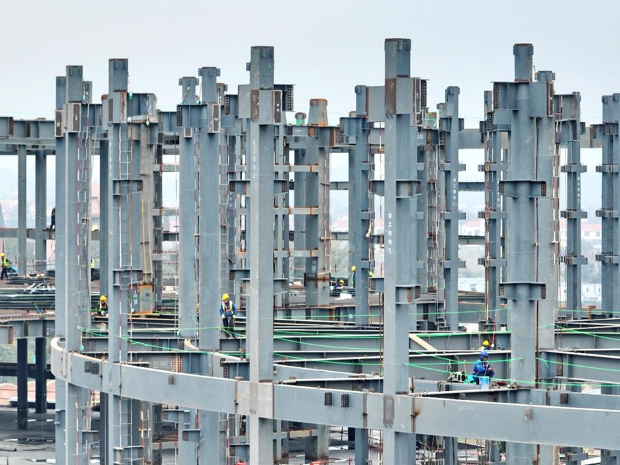 Steel structures of a prefabricated building are welded in Nankang district, Ganzhou, east China's Jiangxi province. (People's Daily Online/Zhu Haipeng)