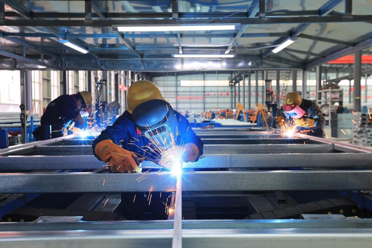 Parts of prefabricated buildings are welded in a workshop of a company in Tangshan, north China's Hebei province. (People's Daily Online/Yao Wenhai)