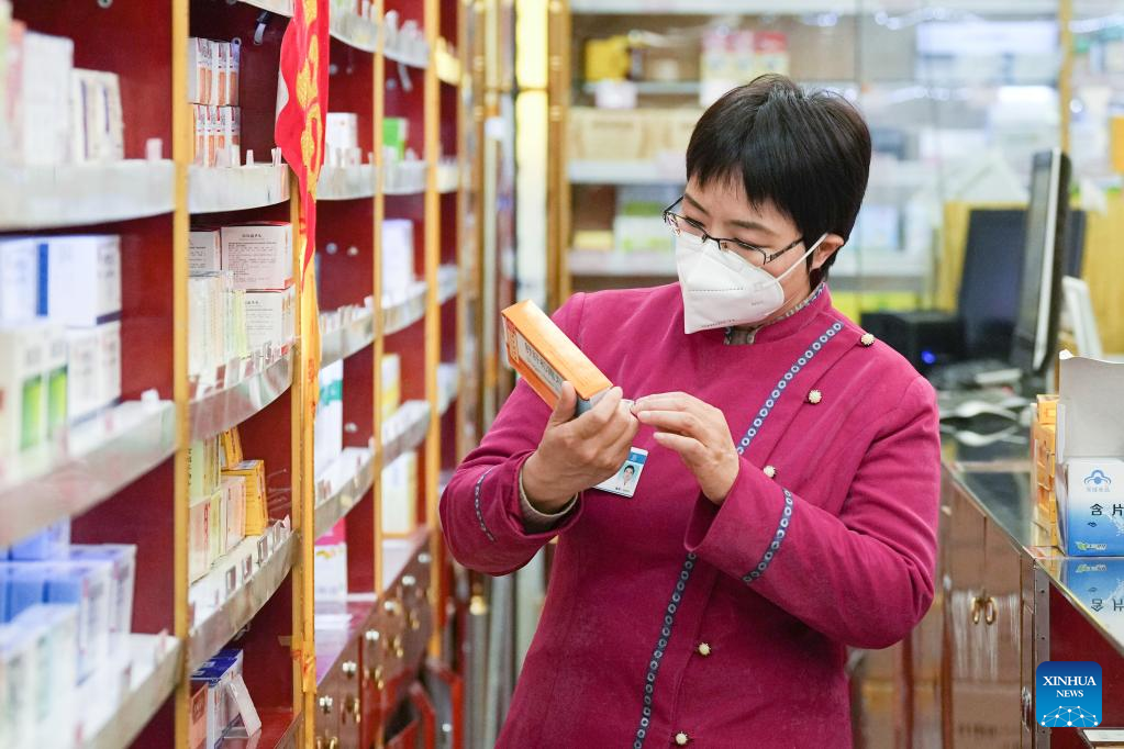 This photo taken on Feb. 22, 2023 shows pharmacist Zhang Haiou checking on medicines at Baita Temple pharmacy in Beijing, capital of China. (Xinhua/Ju Huanzong)