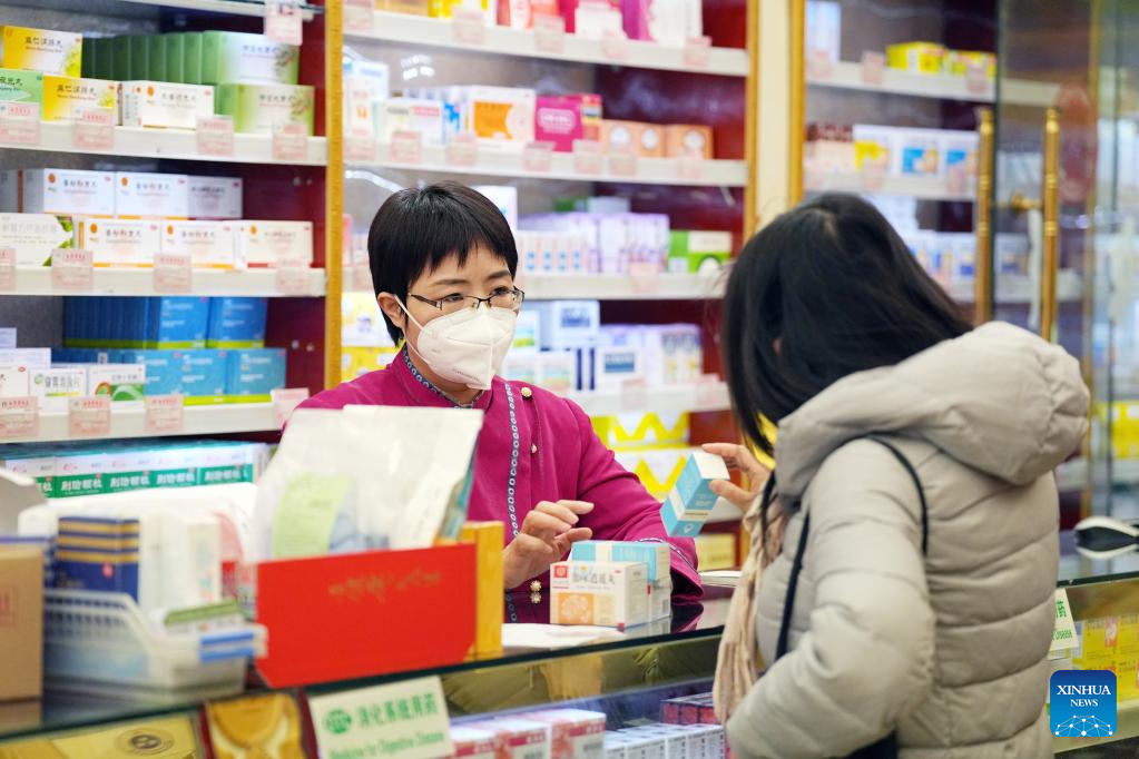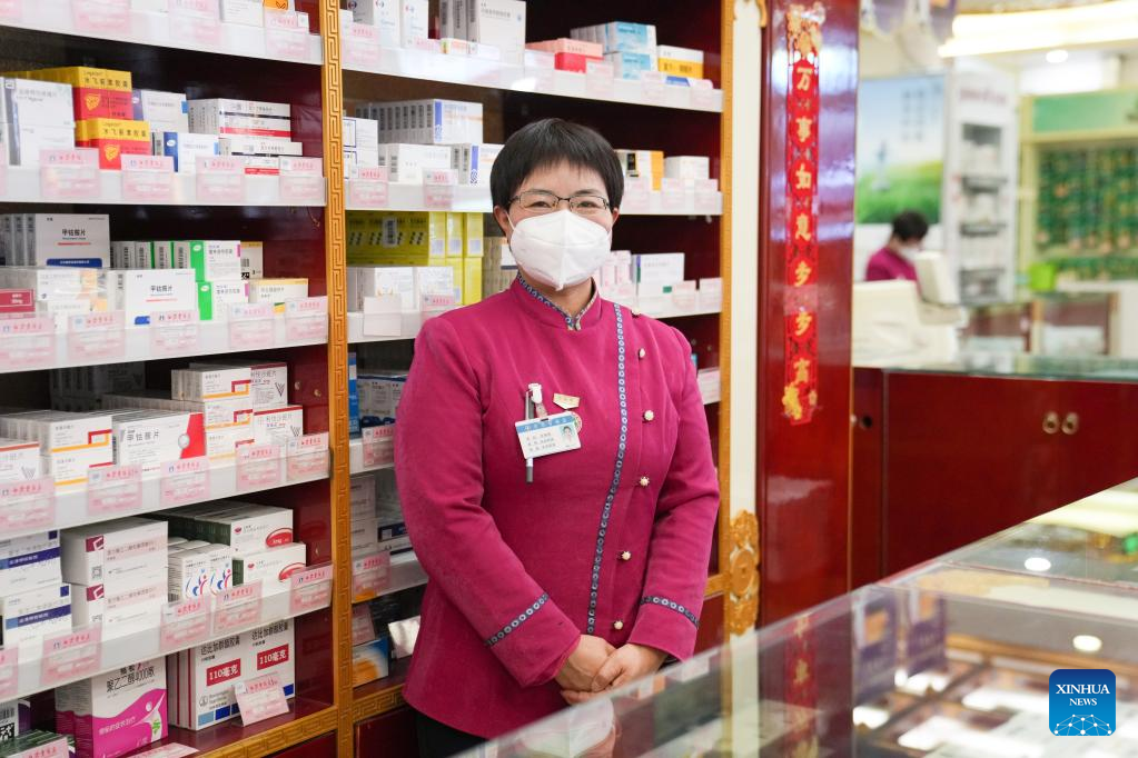 This photo taken on Feb. 14, 2023 shows pharmacist Zhang Haiou at Baita Temple pharmacy of Beijing Golden Elephant Fortune Pharmacy Stock Co., Ltd. in Beijing, capital of China. (Xinhua/Ju Huanzong)