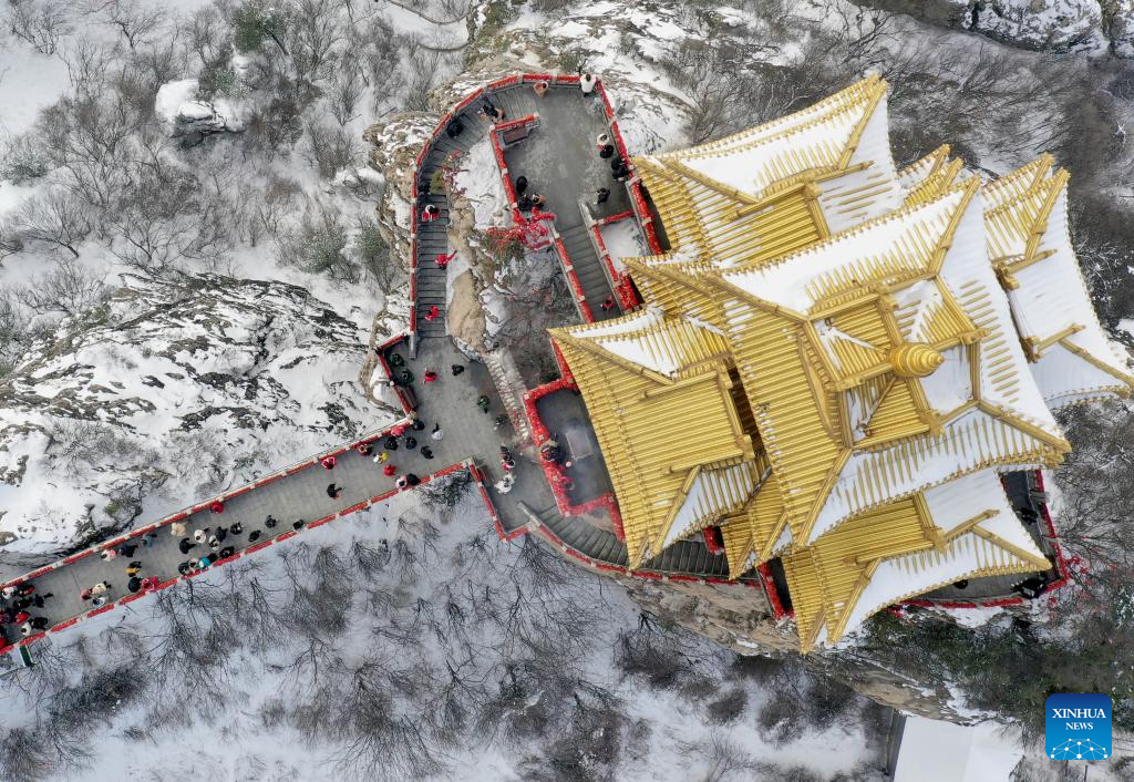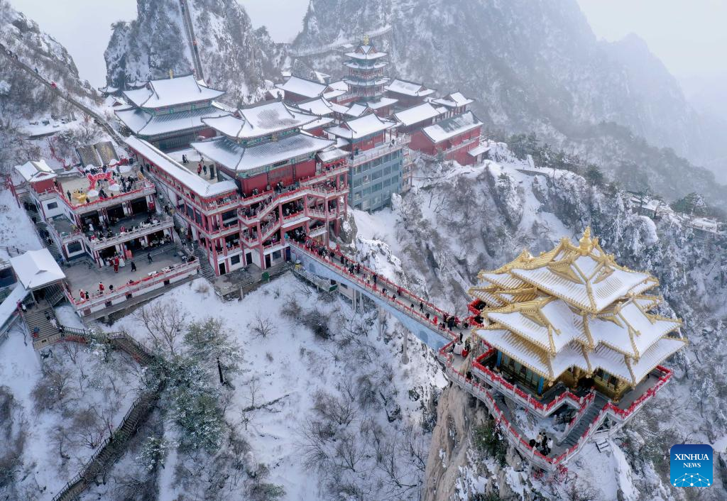 This aerial photo taken on Feb. 23, 2023 shows visitors enjoying the scenery of the Laojun Mountain scenic spot in Luanchuan County of Luoyang, central China's Henan Province. Official data showed that the city saw 10.31 million trips in January of 2023, generating 6.28 billion yuan (about 902.44 million U.S. dollars) in revenue, up 746.63 percent and 690.06 percent year on year respectively. (Xinhua/Li An)