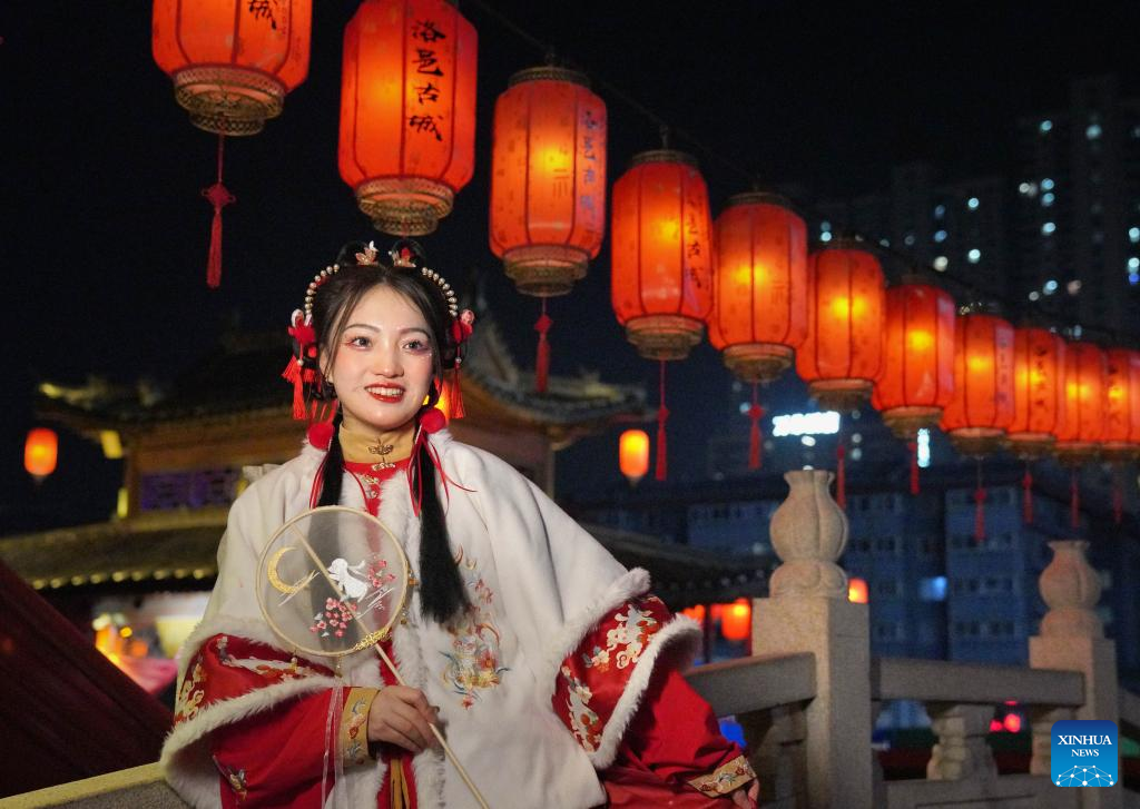 A tourist poses for photos at Luoyi ancient city in Luoyang, central China's Henan Province, Feb. 22, 2023. Official data showed that the city saw 10.31 million trips in January of 2023, generating 6.28 billion yuan (about 902.44 million U.S. dollars) in revenue, up 746.63 percent and 690.06 percent year on year respectively. (Xinhua/Li An)