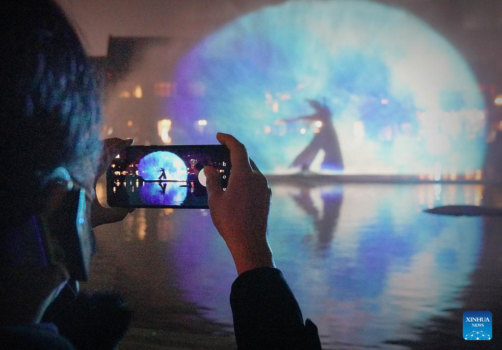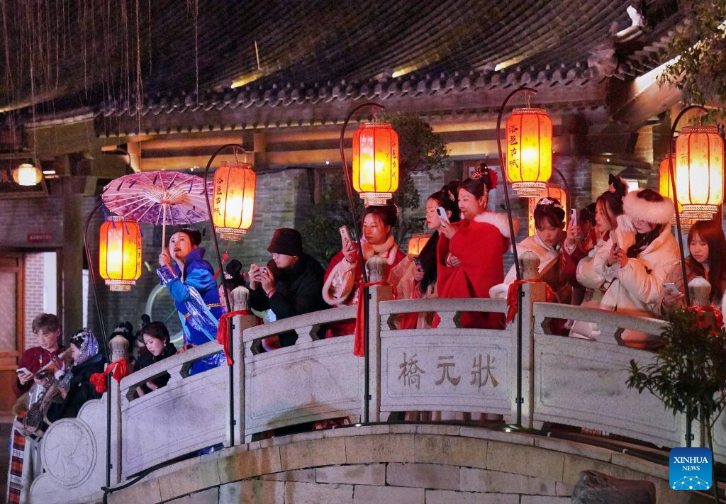 Tourists watch a film at Luoyi ancient city in Luoyang, central China's Henan Province, Feb. 22, 2023. Official data showed that the city saw 10.31 million trips in January of 2023, generating 6.28 billion yuan (about 902.44 million U.S. dollars) in revenue, up 746.63 percent and 690.06 percent year on year respectively. (Xinhua/Li An)