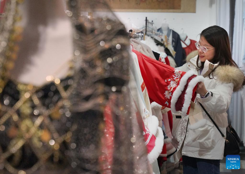 A tourist selects clothes at a store in Luoyi ancient city of Luoyang, central China's Henan Province, Feb. 22, 2023. Official data showed that the city saw 10.31 million trips in January of 2023, generating 6.28 billion yuan (about 902.44 million U.S. dollars) in revenue, up 746.63 percent and 690.06 percent year on year respectively. (Xinhua/Li An)