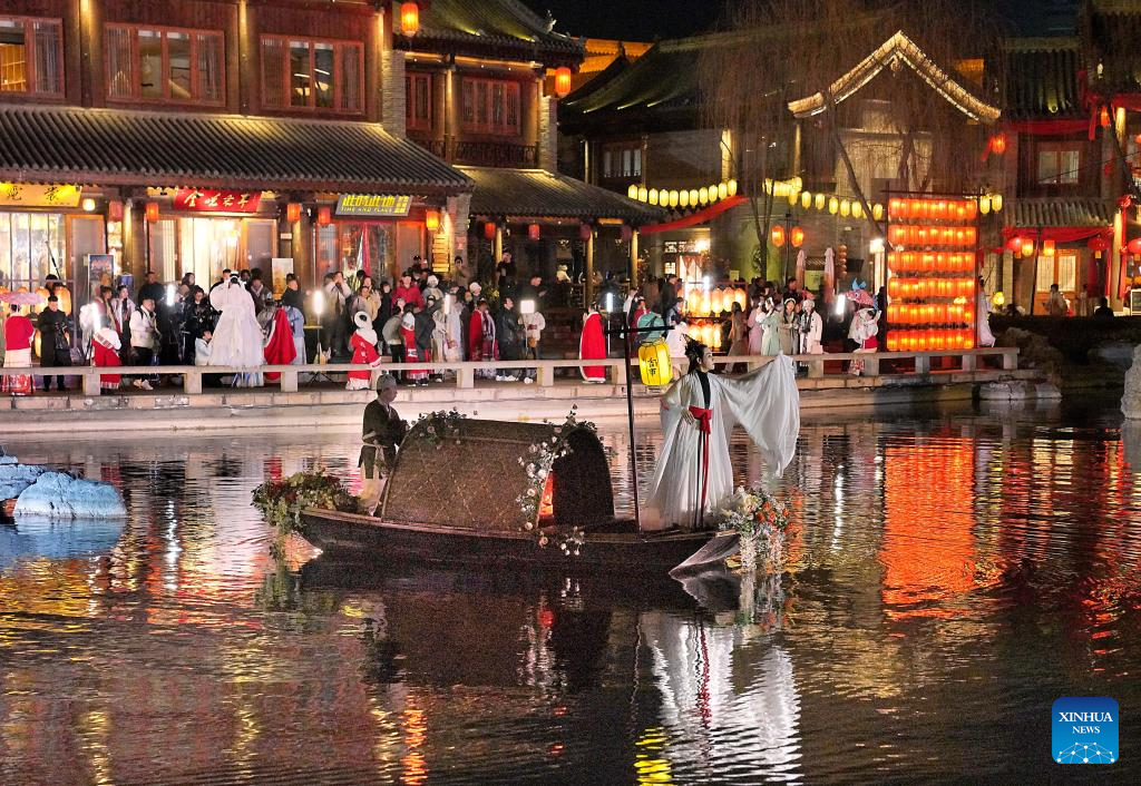 Actors perform at Luoyi ancient city in Luoyang, central China's Henan Province, Feb. 22, 2023. Official data showed that the city saw 10.31 million trips in January of 2023, generating 6.28 billion yuan (about 902.44 million U.S. dollars) in revenue, up 746.63 percent and 690.06 percent year on year respectively. (Xinhua/Li An)