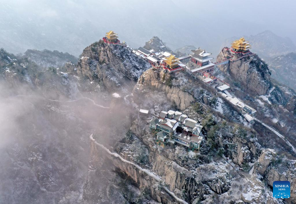 This aerial photo taken on Feb. 23, 2023 shows the scenery of the Laojun Mountain scenic spot in Luanchuan County of Luoyang, central China's Henan Province. Official data showed that the city saw 10.31 million trips in January of 2023, generating 6.28 billion yuan (about 902.44 million U.S. dollars) in revenue, up 746.63 percent and 690.06 percent year on year respectively. (Xinhua/Li An)