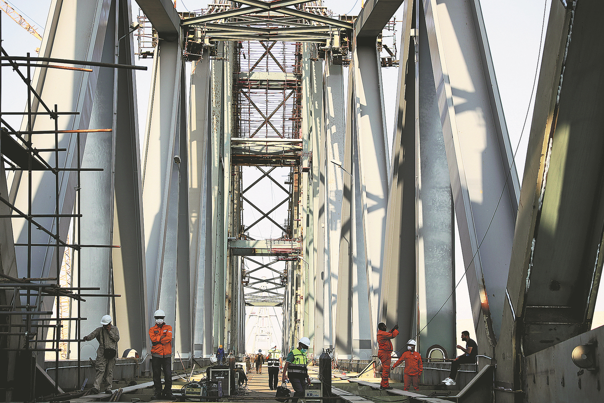 Workers at the construction site of the Suez Canal Railway Bridge in Ismailia, Egypt, on June 5. Chinese companies have been pushing forward in upgrading this bridge. WANG DONGZHEN/XINHUA