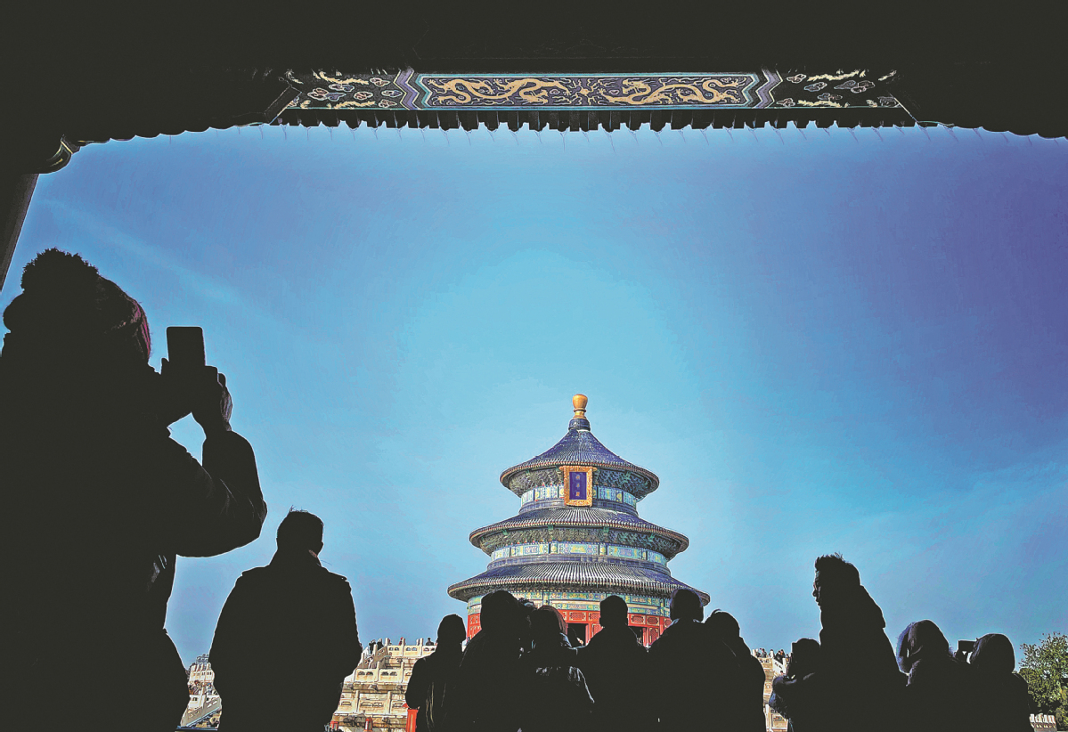 Visitors to the Temple of Heaven in Beijing enjoy a clear sky in November 2021. [Photo by Du Lianyi/China Daily]