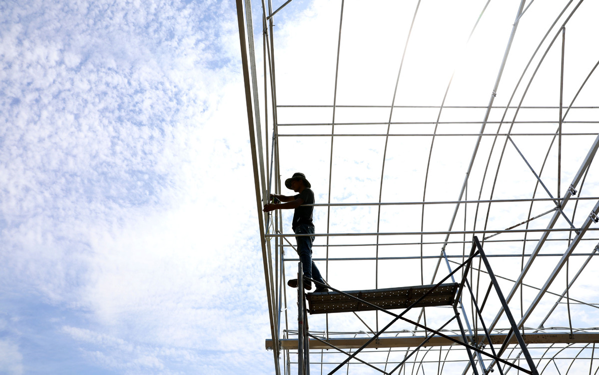 A worker works on a construction site under a cloudy sky in Shijiazhuang, Hebei province, on Aug 4, 2021. [Photo/Xinhua]