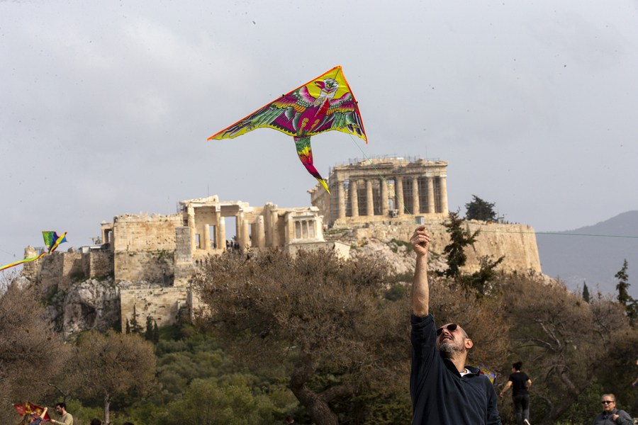 A man flies a kite on the occasion of Clean Monday at Filopappou Hill in Athens, Greece, on Feb. 27, 2023. (Xinhua/Marios Lolos)