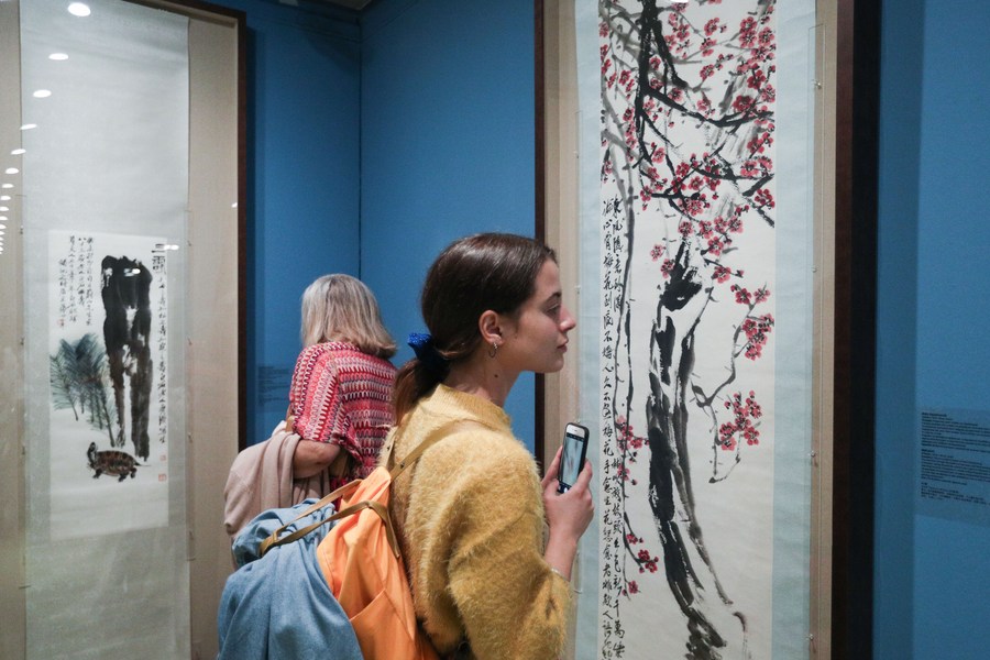 Visitors view exhibits during an art exhibition of creations by Chinese artist Qi Baishi at the B&M Theocharakis in Athens, Greece, Nov. 12, 2019. (Xinhua/Zheng Huansong)