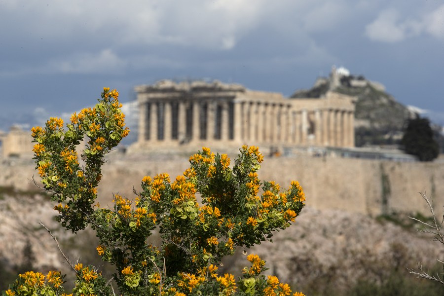 Photo taken on March 14, 2022 shows flowers blossoming at Filopappou Hill opposite Acropolis in Athens, Greece. (Xinhua/Marios Lolos)