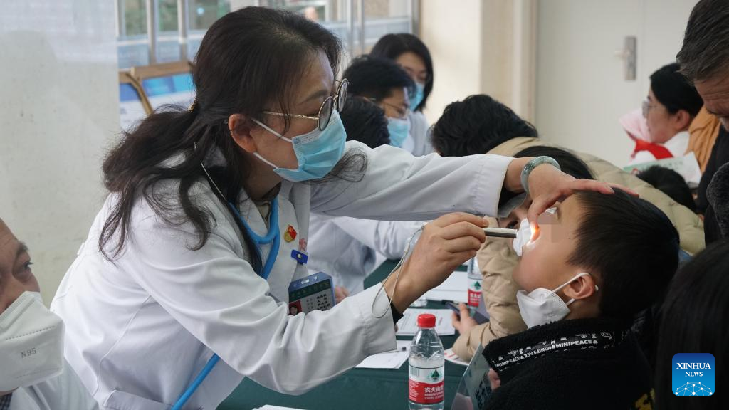 A doctor gives a boy medical treatment during an event held by Guizhou Provincial People's Hospital and the Guizhou Hospital of Shanghai Children's Medical Center to provide children with free multidisciplinary consultation and gene tests in Guiyang, southwest China's Guizhou Province, Feb. 28, 2023. (Xinhua)