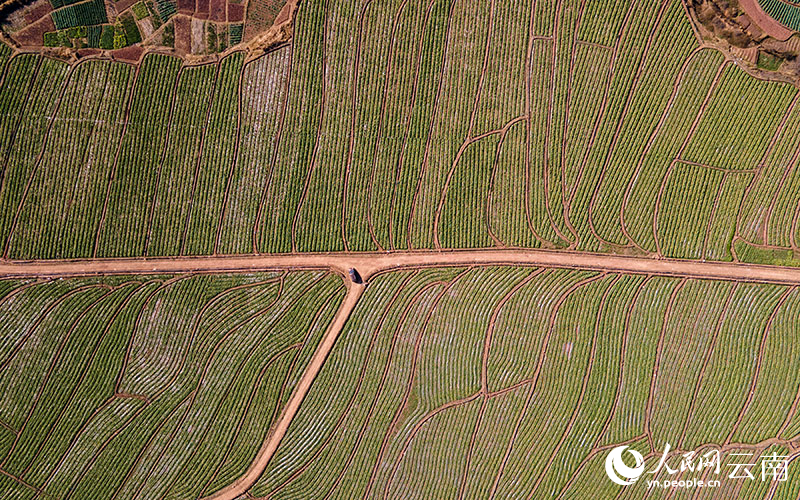 Photo shows a planting base of gongcai, a green dehydrated vegetable of the lettuce family, in Nanhua county, Chuxiong Yi Autonomous Prefecture, southwest China’s Yunnan Province. (People’s Daily Online/Hu Zunhui)