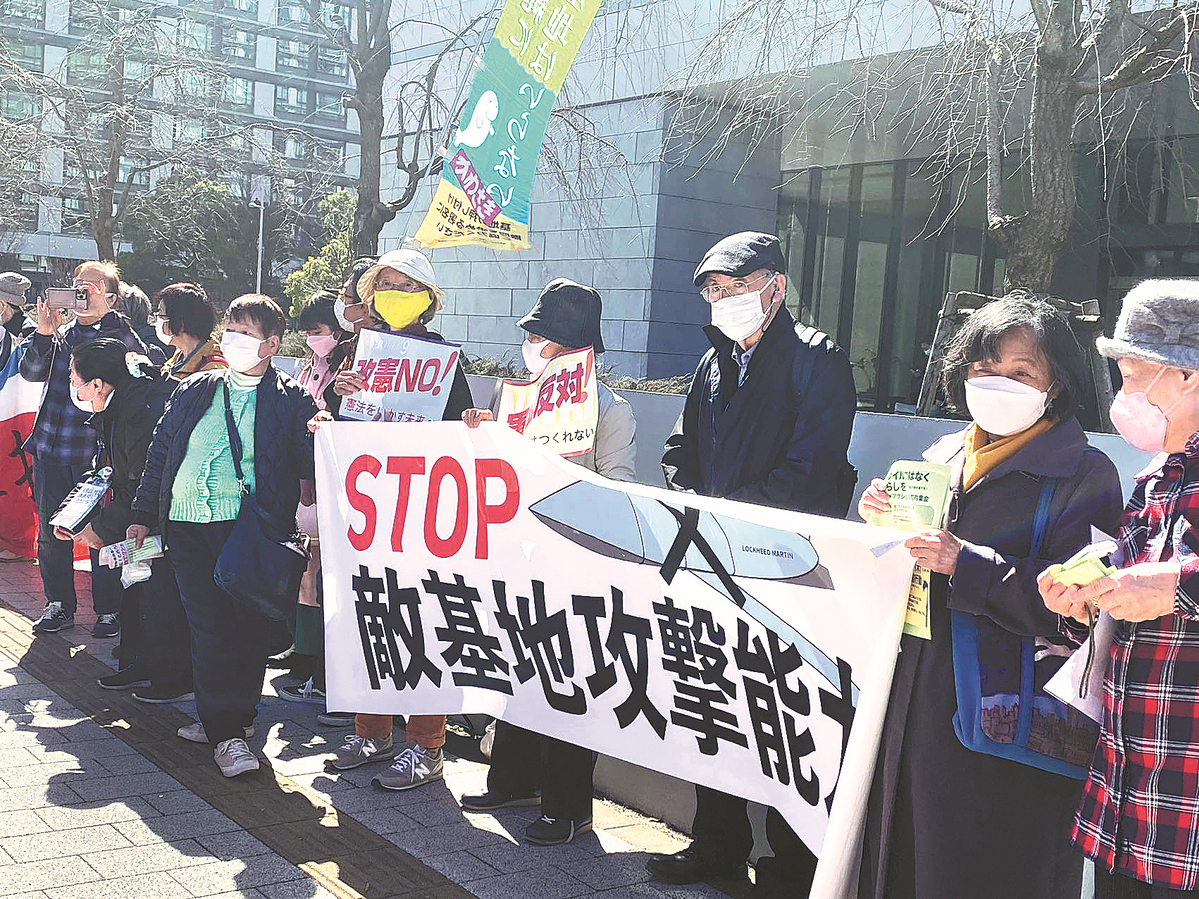 In a protest outside the country's parliament on Tuesday, Mizuho Fukushima, head of the Social Democratic Party, said that instead of military spending, Japan should invest more in areas such as education and social security, and in helping small and medium-sized companies recover from the pandemic.