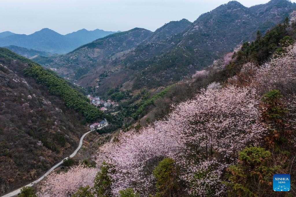This aerial photo taken on March 1, 2023 shows cherry blossoms in Datang Village of Sandu Township, Jiande, east China's Zhejiang Province. In recent years, Sandu Township has helped local residents increase their incomes by promoting seasonal sight-seeing routes which feature mountain cherry blossoms, camping sites and hostels. (Xinhua/Xu Yu)