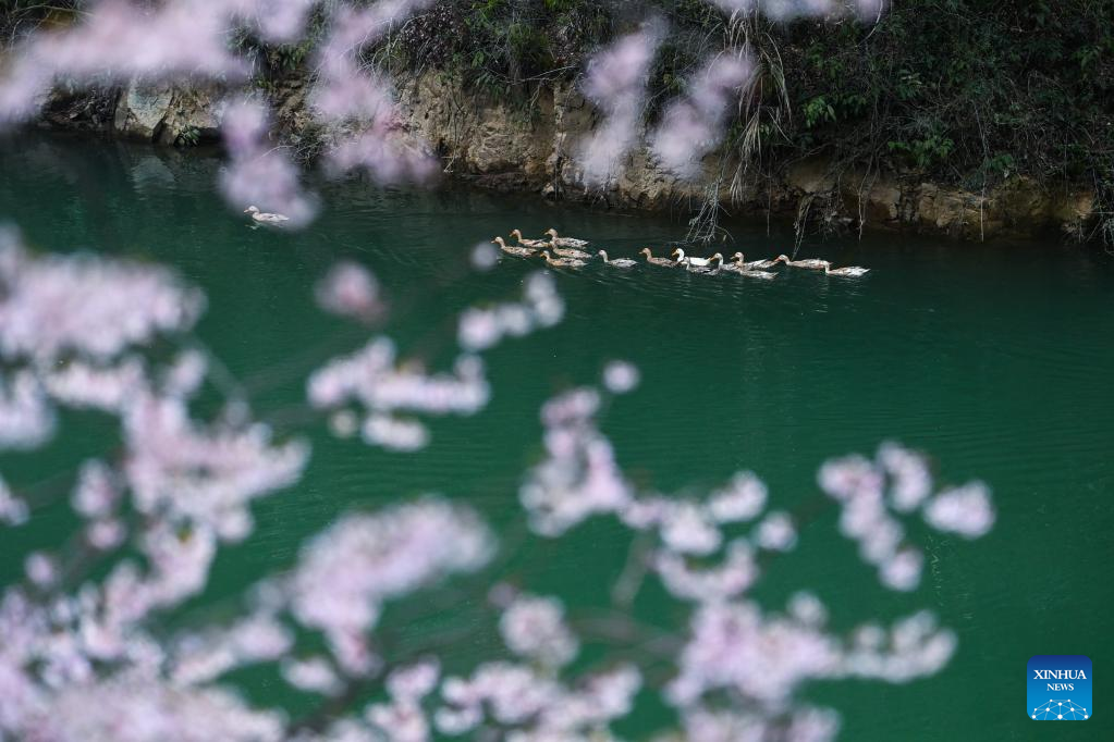 This photo taken on March 1, 2023 shows a flock of ducks seen through cherry blossoms in Datang Village of Sandu Township, Jiande, east China's Zhejiang Province. In recent years, Sandu Township has helped local residents increase their incomes by promoting seasonal sight-seeing routes which feature mountain cherry blossoms, camping sites and hostels. (Xinhua/Xu Yu)