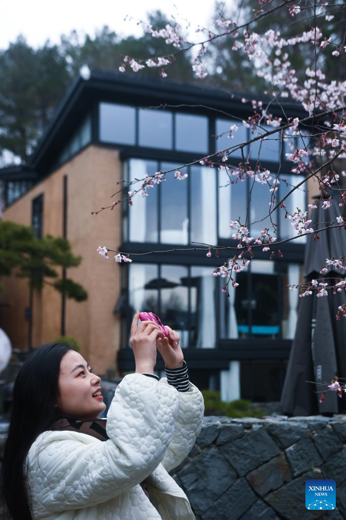 A tourist takes photos of cherry blossoms at a hostel in Qianyuan Village of Sandu Township, Jiande, east China's Zhejiang Province, Feb. 28, 2023. In recent years, Sandu Township has helped local residents increase their incomes by promoting seasonal sight-seeing routes which feature mountain cherry blossoms, camping sites and hostels. (Xinhua/Xu Yu)