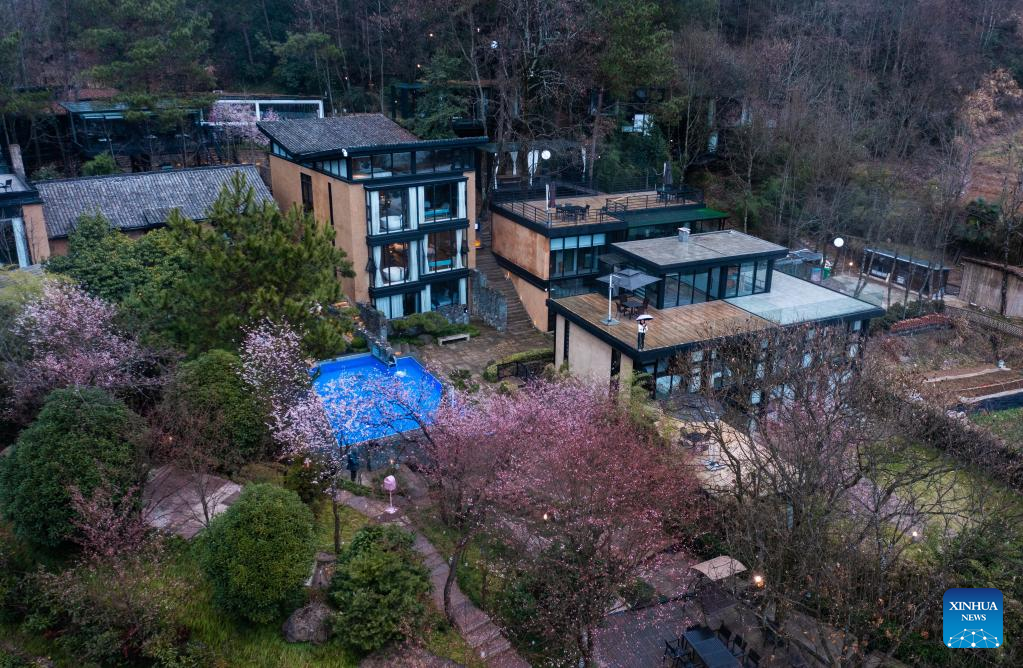 This aerial photo taken on Feb. 28, 2023 shows a hostel in Qianyuan Village of Sandu Township, Jiande, east China's Zhejiang Province. In recent years, Sandu Township has helped local residents increase their incomes by promoting seasonal sight-seeing routes which feature mountain cherry blossoms, camping sites and hostels. (Xinhua/Xu Yu)